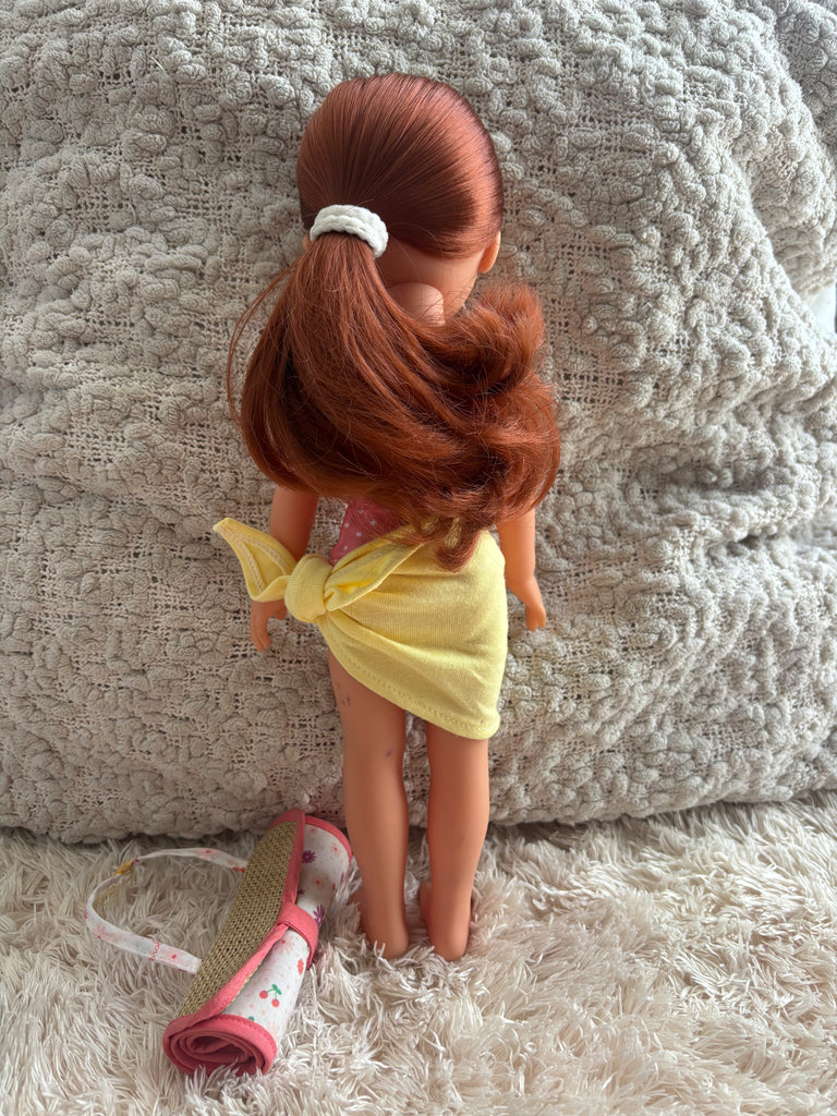 She has long silky hair easy to comb. His face, his arms and legs are made of soft vinyl to the touch, with a delicate vanilla scent. .